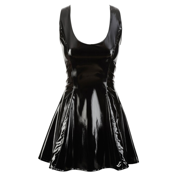 Denne korte, ermeløse kjolen fra Black Level er laget i sort, skinnende og blank lakkmateriale. Kjolen har en dyp utrigning foran og bak, med et utsvingt skjørt.