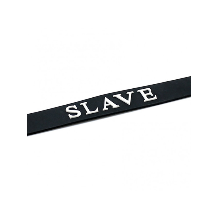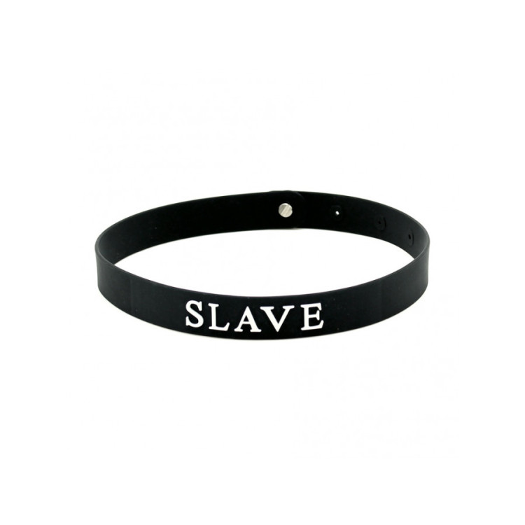 Collar i silikon med teksten SLAVE uthevet i hvit skrift.